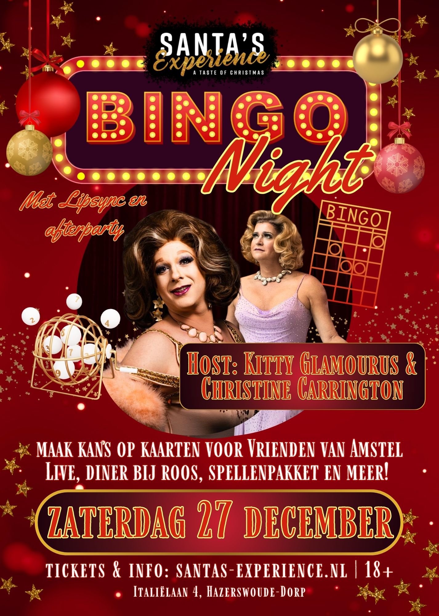 Stap binnen in het magische winterdorp Santa’s Experience en bereid je voor op de tweede editie van de jaarlijkse bingo-avond die je niet wilt missen. Dit jaar gehost door niet één maar twee fabulous Dragqueens Kitty Glamourus & Christine Carrington!